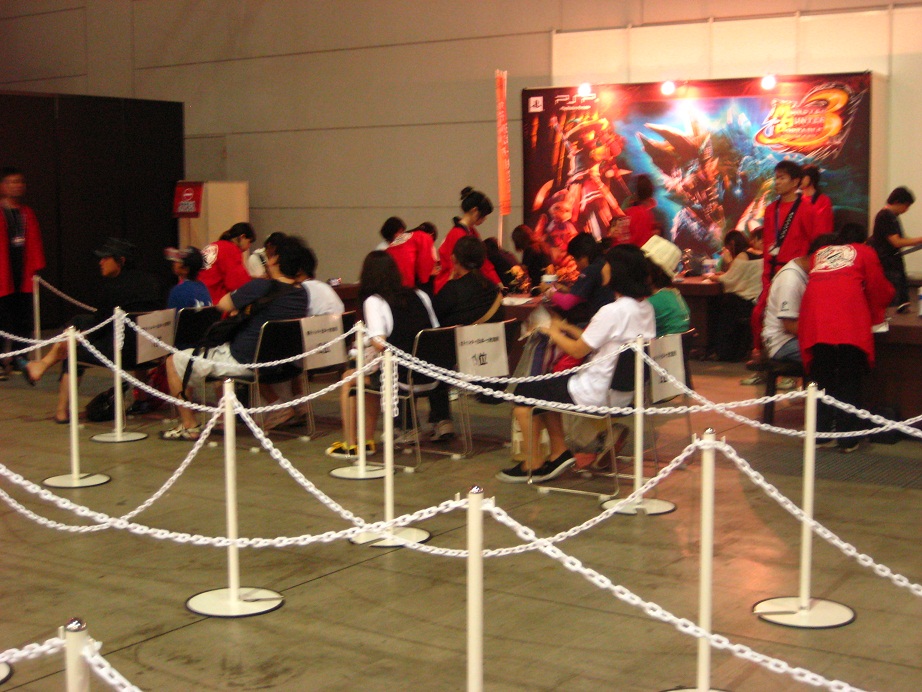 狩王決定戦の予選開始時刻は10:30。 4人席のテーブルが8つあり、16チームずつ一度に出来るようです。テーブルにはコードに繋がれたPSP3000番。 ドキドキしながら自分の順番を待ちます。 |
